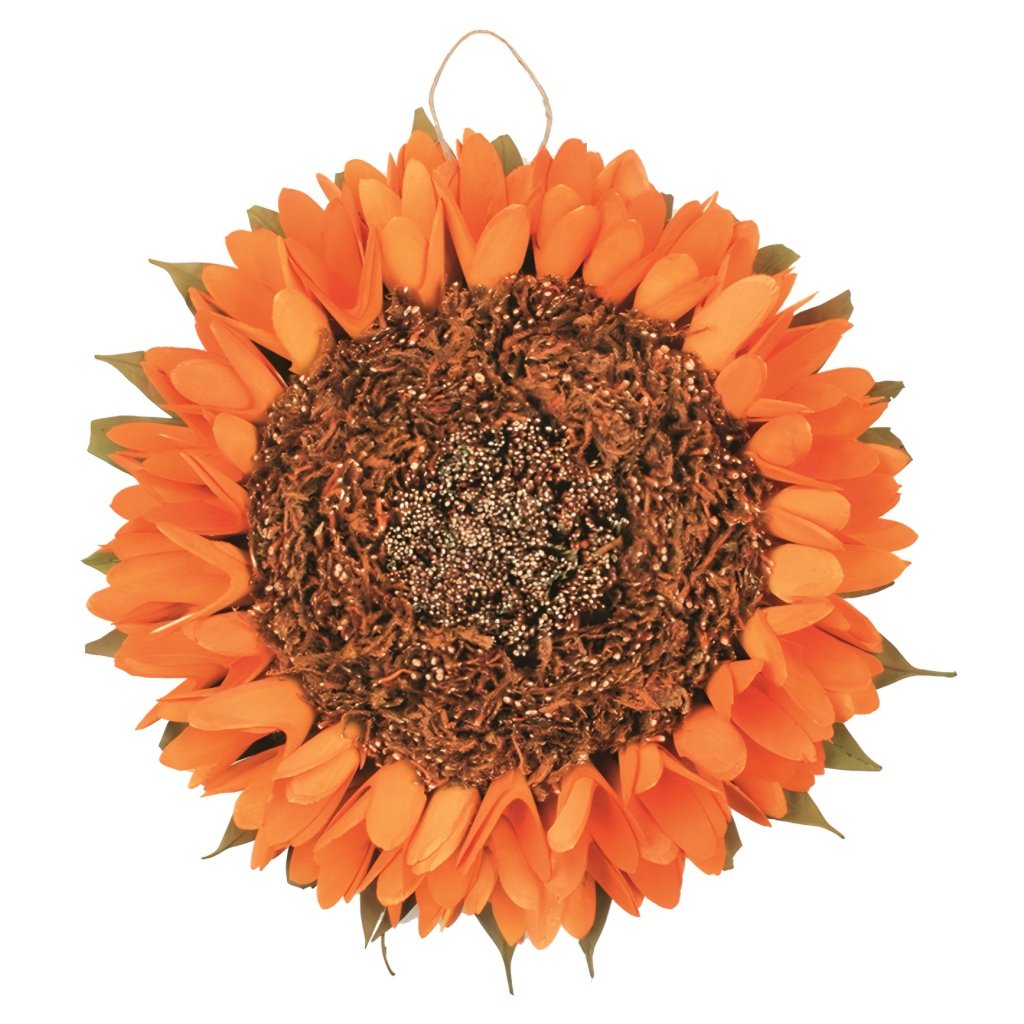 Dekorace ve tvaru slunečnice k zavěšení o průměru 27 cm.