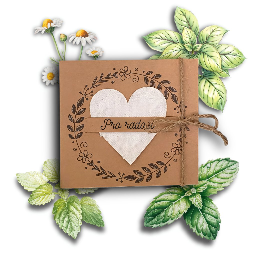 Dárkové přání se semínky bylinek (máta/meduňka/bazalka).