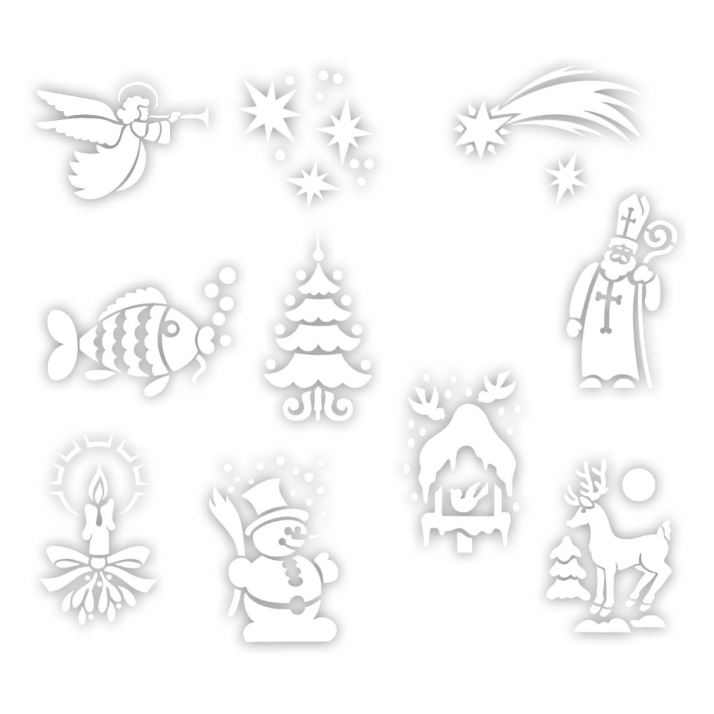 - Balení obsahuje 10 šablon - anděl, hvězdy, kometa, kapr, Mikuláš, svíčka, krmítko, sněhulák, sob, vánoční strom