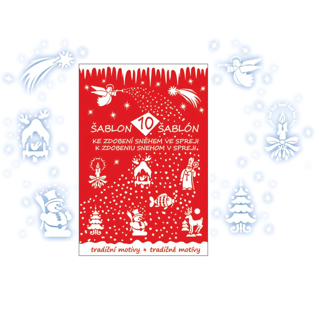 Balení 10 šablon pro tvoření sněhem ve spreji, foukacími fixkami či jinými spreji.