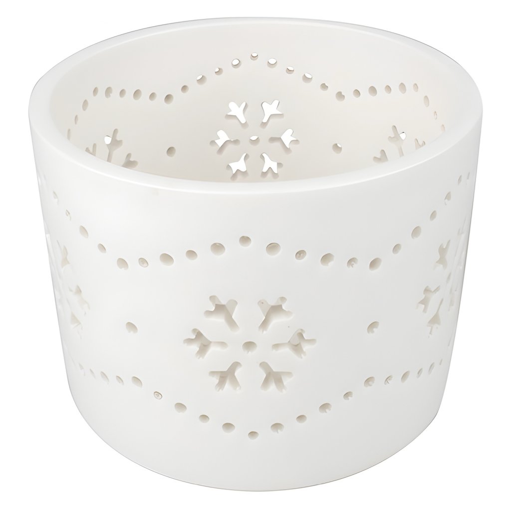 Porcelánový svícen zdobený decentním vzorem s vločkami.